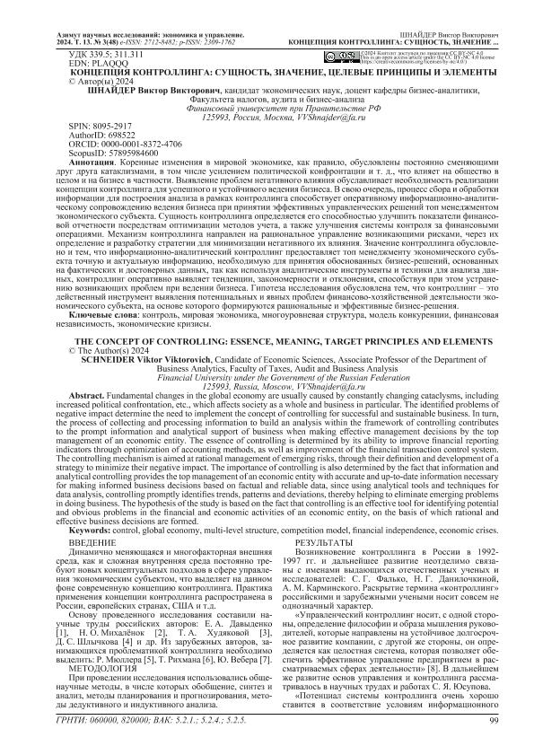 Шнайдер, В.В. Концепция контроллинга: сущность, значение, целевые принципы и элементы // Азимут научных исследований: экономика и управление. – 2024. – № 3. — С. 99-101. — Только в электронном виде. — <URL:http://elib.fa.ru/art2024/bv3275.pdf>.