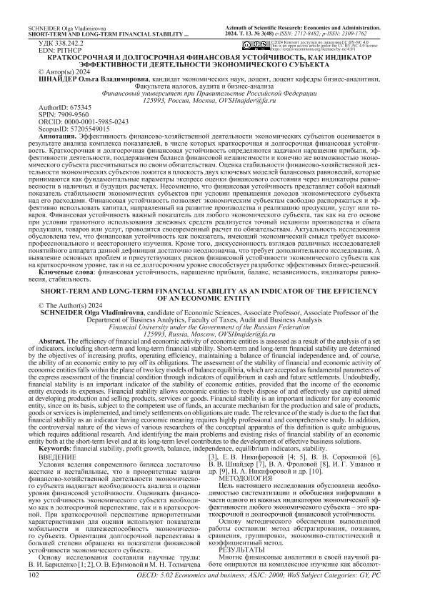 Шнайдер, О.В. Краткосрочная и долгосрочная финансовая устойчивость, как индикатор эффективности деятельности экономического субъекта // Азимут научных исследований: экономика и управление. – 2024. – № 3. — С. 102-105. — Только в электронном виде. — <URL:http://elib.fa.ru/art2024/bv3276.pdf>.