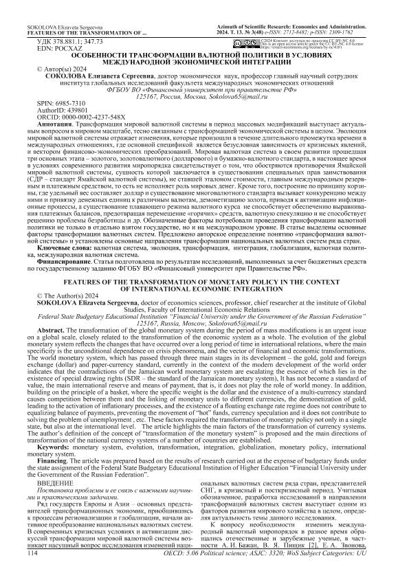 Соколова, Е.С. Особенности трансформации валютной политики в условиях международной экономической интеграции // Азимут научных исследований: экономика и управление. – 2024. – № 3. — С. 114-118. — Только в электронном виде. — <URL:http://elib.fa.ru/art2024/bv3277.pdf>.