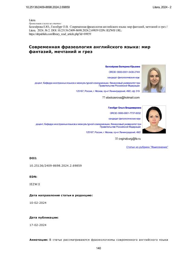 фантазий, мечтаний и грез / Е.Ю. Белозерова, О.В. Гинзбург. — Текст: электронный // Litera. – 2024. – № 2. — C. 140-146. - URL: https://nbpublish.com/library_read_article.php?id=69859. - Дата публикации: 17.02.2024 — <URL:http://elib.fa.ru/art2024/bv3278.pdf>.