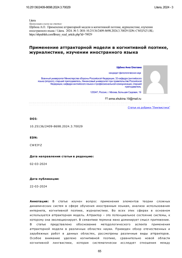 Шубина, А.О. Применение аттракторной модели в когнитивной поэтике, журналистике, изучении иностранного языка. — Текст: электронный // Litera. – 2024. – № 3. — C. 65-81. - URL: https://nbpublish.com/library_read_article.php?id=70029. - Дата публикации: 22.03.2024 — <URL:http://elib.fa.ru/art2024/bv3279.pdf>.