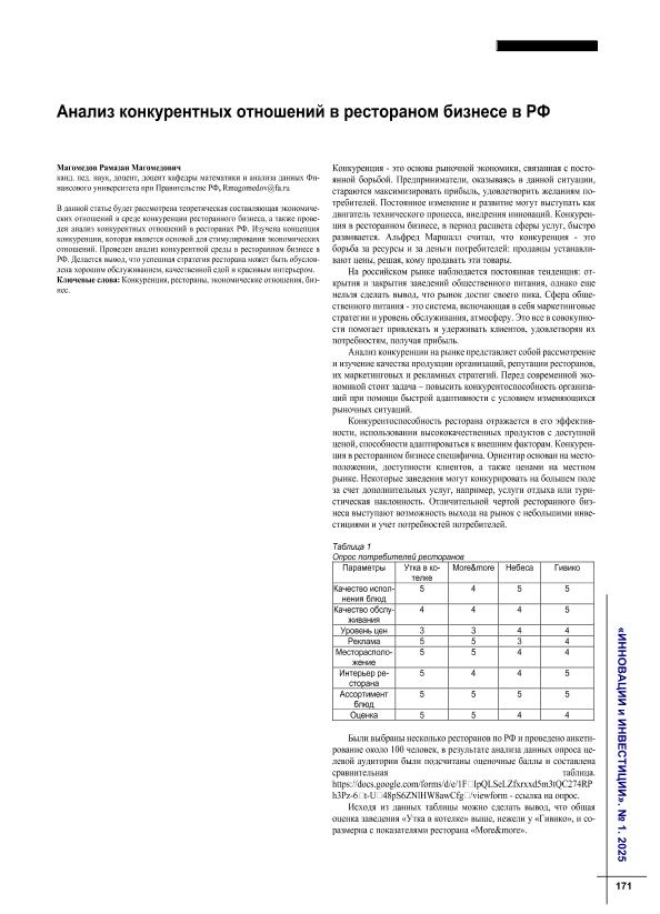 Магомедов, Р.М. Анализ конкурентных отношений в рестораном // Инновации и инвестиции. – 2025. – № 1. — С. 171-174. — Только в электронном виде. — <URL:http://elib.fa.ru/art2025/bv1012.pdf>.