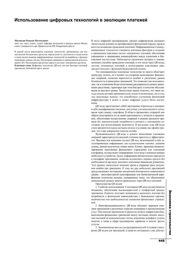 Магомедов, Р.М. Использование цифровых технологий в эволюции платежей // Экономика строительства. – 2025. – № 3. — С. 445-448. — Только в электронном виде. — <URL:http://elib.fa.ru/art2025/bv1013.pdf>.