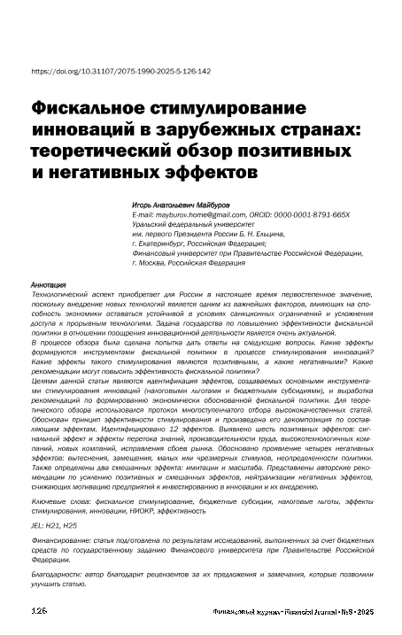 Майбуров, И.А. Фискальное стимулирование инноваций в зарубежных странах: теоретический обзор позитивных и негативных эффектов // Финансовый журнал. – 2025. – № 5. — С. 126-142 — <URL:http://elib.fa.ru/art2025/bv1014.pdf>.