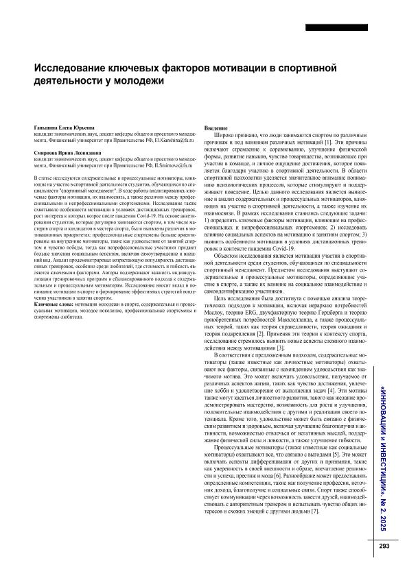 Ганьшина, Е.Ю. Исследование ключевых факторов мотивации в спортивной деятельности у молодежи / Е.Ю. Ганьшина, И.Л. Смирнова // Инновации и инвестиции. – 2025. – № 2. — С. 293-297. — Только в электронном виде. — <URL:http://elib.fa.ru/art2025/bv1015.pdf>.