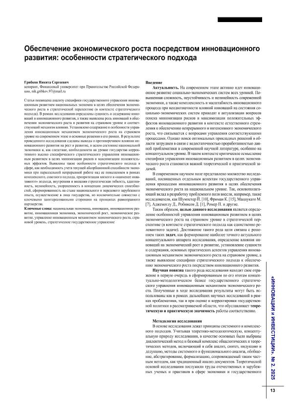 Грибков, Н.С. Обеспечение экономического роста посредством инновационного развития: особенности стратегического подхода // Инновации и инвестиции. – 2025. – № 2. — С. 13-17. — Только в электронном виде. — <URL:http://elib.fa.ru/art2025/bv1016.pdf>.