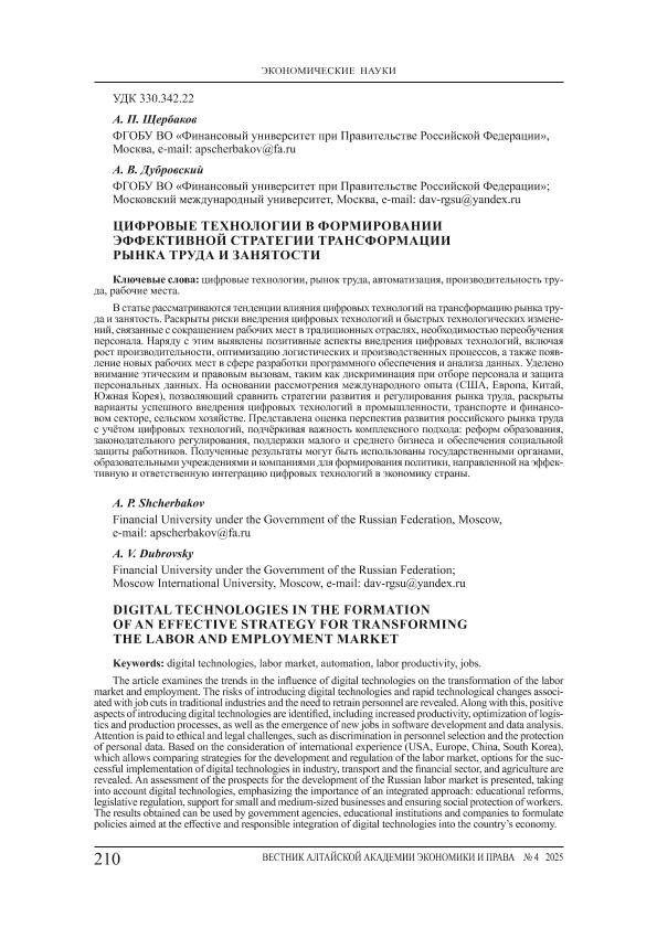 Щербаков, А.П. Цифровые технологии в формировании эффективной стратегии трансформации рынка труда и занятости / А.П. Щербаков, А.В. Дубровский // Вестник Алтайской академии экономики и права. – 2025. – № 4-1. — С. 210-216. — Только в электронном виде. — <URL:http://elib.fa.ru/art2025/bv1636.pdf>.