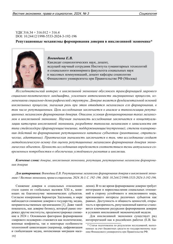 Воеводина, Е.В. Репутационные механизмы формирования доверия в инклюзивной экономике // Вестник экономики, права и социологии. – 2024. – № 3. — С. 192-196. — Только в электронном виде. — <URL:http://elib.fa.ru/art2024/bv3391.pdf>.
