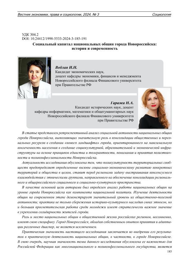 Воблая, И.Н. Социальный капитал национальных общин города Новороссийска: история и современность / И.Н. Воблая, Н.А. Гаража // Вестник экономики, права и социологии. – 2024. – № 3. — С. 185-191. — Только в электронном виде. — <URL:http://elib.fa.ru/art2024/bv3392.pdf>.