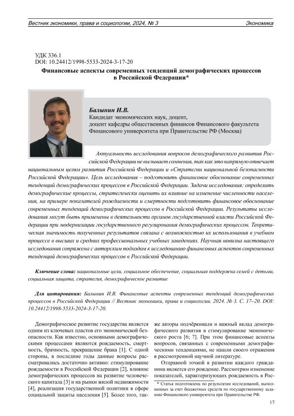 Балынин, И.В. Финансовые аспекты современных тенденций демографических процессов в Российской Федерации // Вестник экономики, права и социологии. – 2024. – № 3. — С. 17-20. — Только в электронном виде. — <URL:http://elib.fa.ru/art2024/bv3393.pdf>.