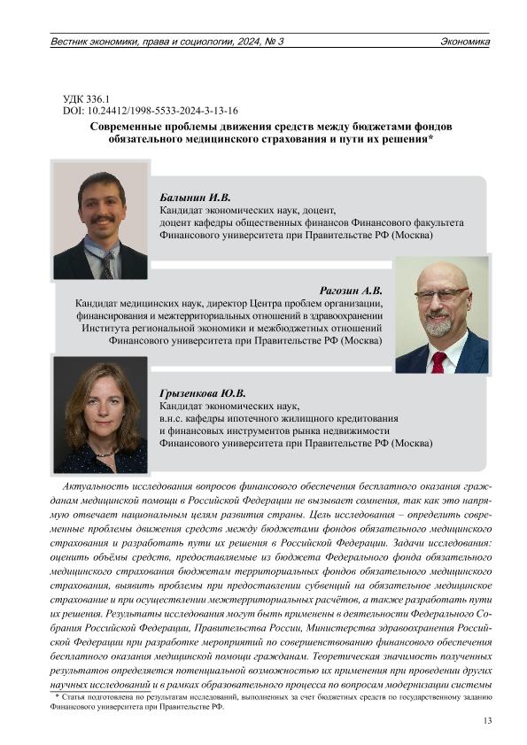Балынин, И.В. Современные проблемы движения средств между бюджетами фондов обязательного медицинского страхования и пути их решения / И.В. Балынин, А.В. Рагозин, Ю.В. Грызенкова // Вестник экономики, права и социологии. – 2024. – № 3. — С. 13-16. — Только в электронном виде. — <URL:http://elib.fa.ru/art2024/bv3394.pdf>.