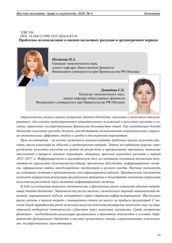 Полякова, О.А. Проблемы целеполагания и оценки налоговых расходов в среднесрочном периоде / О.А. Полякова, С.Е. Демидова // Вестник экономики, права и социологии. – 2024. – № 4. — С. 83-91. — Только в электронном виде. — <URL:http://elib.fa.ru/art2024/bv3395.pdf>.