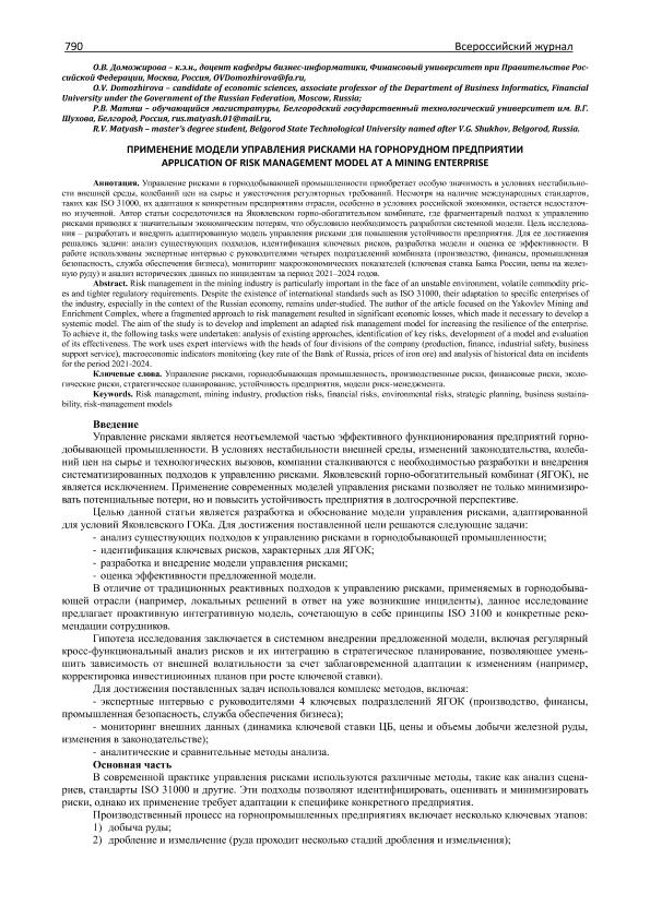 Доможирова, О.В. Применение модели управления рисками на горнорудном предприятии / О.В. Доможирова, Р.В. Матяш // Вестник Академии знаний. – 2025. – № 3. — С. 790-797. — Только в электронном виде. — <URL:http://elib.fa.ru/art2025/bv594.pdf>.