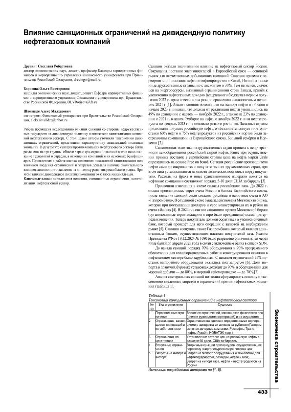 Древинг, С.Р. Влияние санкционных ограничений на дивидендную политику нефтегазовых компаний / С.Р. Древинг, О.В. Борисова, А.М. Швелидзе // Экономика строительства. – 2025. – № 5. — С. 433-438. — Только в электронном виде. — <URL:http://elib.fa.ru/art2025/bv595.pdf>.