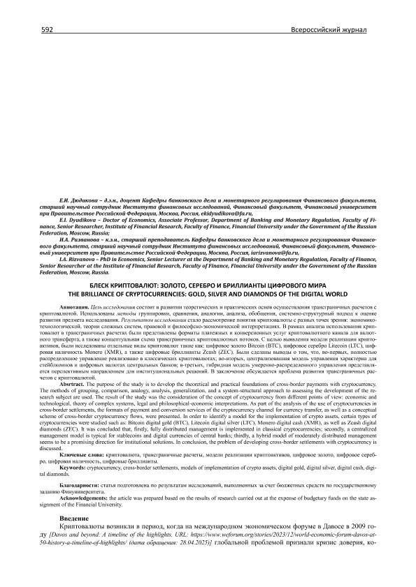 Дюдикова, Е.И. Блеск криптовалют: золото, серебро и бриллианты цифрового мира / Е.И. Дюдикова, И.А. Ризванова // Вестник Академии знаний. – 2025. – № 3. — С. 592-597. — Только в электронном виде. — <URL:http://elib.fa.ru/art2025/bv596.pdf>.