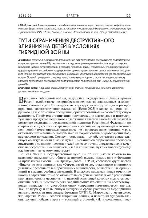 Ежов, Д.А. Пути ограничения деструктивного влияния на детей в условиях гибридной войны // Власть. – 2025. – № 5. — С. 133-135 — <URL:http://elib.fa.ru/art2025/bv597.pdf>.