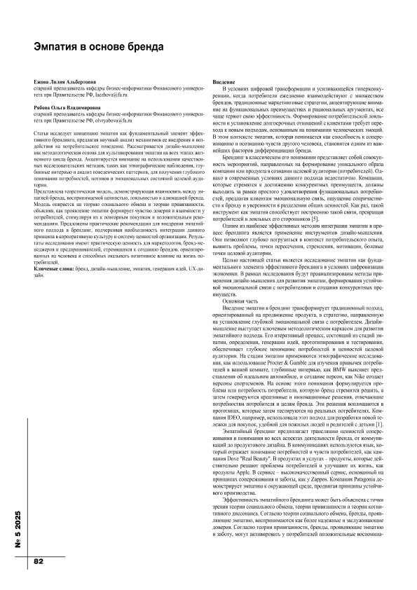 Ежова, Л.А. Эмпатия в основе бренда / Л.А. Ежова, О.В. Рябова // Экономика строительства. – 2025. – № 5. — С. 82-84. — Только в электронном виде. — <URL:http://elib.fa.ru/art2025/bv598.pdf>.