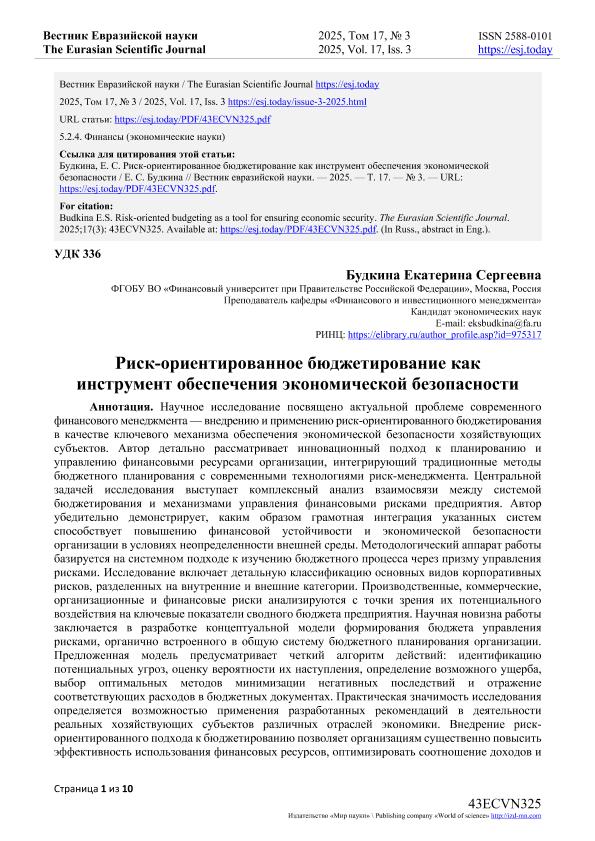Будкина, Е.С. Риск-ориентированное бюджетирование как инструмент обеспечения экономической безопасности. — Текст: электронный // Вестник Евразийской науки. – 2025. – № 3. — URL: https://esj.today/PDF/43ECVN325.pdf (дата обращения: 28.11.2025) — <URL:http://elib.fa.ru/art2025/bv787.pdf>.