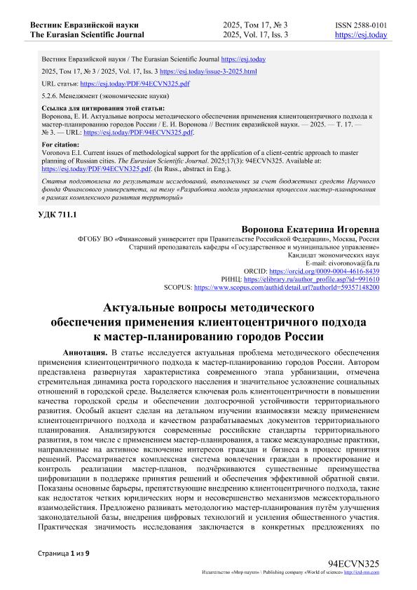 Воронова, Е.И. Актуальные вопросы методического обеспечения применения клиентоцентричного подхода к мастер-планированию городов России. — Текст: электронный // Вестник Евразийской науки. – 2025. – № 3. — URL: https://esj.today/PDF/94ECVN325.pdf (дата обращения: 28.11.2025) — <URL:http://elib.fa.ru/art2025/bv788.pdf>.
