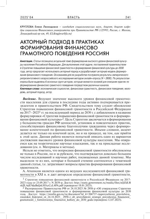 Круглова, Е.Л. Акторный подход в практиках формирования финансово грамотного поведения россиян // Власть. – 2025. – № 4. — С. 241-250 — <URL:http://elib.fa.ru/art2025/bv789.pdf>.