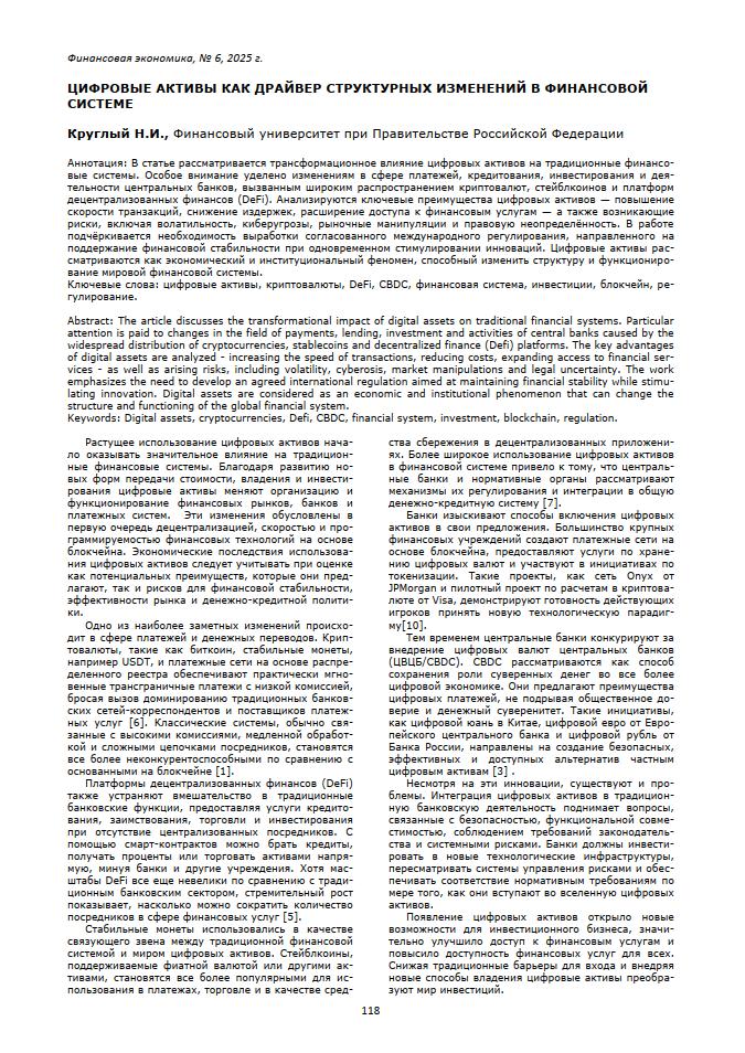 Круглый, Н.И. Цифровые активы как драйвер структурных изменений в финансовой системе // Финансовая экономика. – 2025. – № 6. — С. 118-121 — <URL:http://elib.fa.ru/art2025/bv790.pdf>.