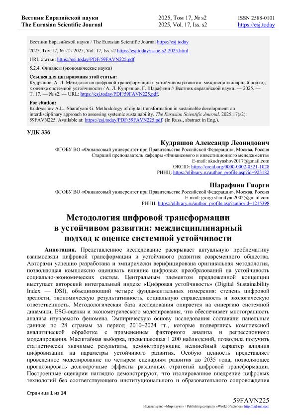 Кудряшов, А.Л. Методология цифровой трансформации в устойчивом развитии: междисциплинарный подход к оценке системной устойчивости / А.Л. Кудряшов, Г. Шарафяни. — Текст: электронный // Вестник Евразийской науки. – 2025. – № s2. — URL: https://esj.today/PDF/59FAVN225.pdf (дата обращения: 27.10.2025) — <URL:http://elib.fa.ru/art2025/bv791.pdf>.