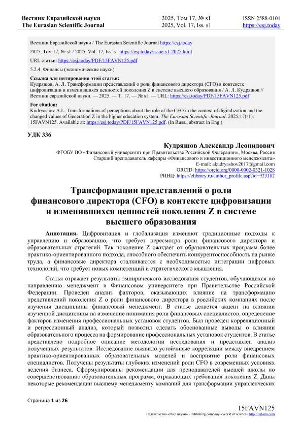 Кудряшов, А.Л. Трансформации представлений о роли финансового директора (CFO) в контексте цифровизации и изменившихся ценностей поколения Z в системе высшего образования. — Текст: электронный // Вестник Евразийской науки. – 2025. – № s1. — URL: https://esj.today/PDF/15FAVN125.pdf (дата обращения: 09.10.2025) — <URL:http://elib.fa.ru/art2025/bv792.pdf>.