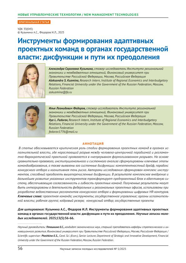 проектных команд в органах государственной власти: дисфункции и пути их преодоления / А.С. Кузьмина, И.Л. Федоров // Научные записки молодых исследователей. – 2025. – № 5. — С. 56-66 — <URL:http://elib.fa.ru/art2025/bv793.pdf>.