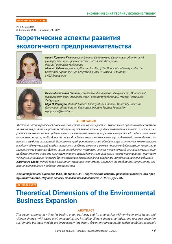 Кулешова, И.Ю. Теоретические аспекты развития экологичного предпринимательства / И.Ю. Кулешова, О.М. Паповян // Научные записки молодых исследователей. – 2025. – № 5. — С. 79-86 — <URL:http://elib.fa.ru/art2025/bv794.pdf>.