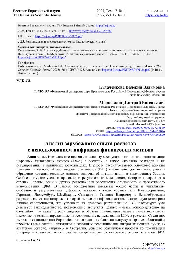 Кулаченкова, В.В. Анализ зарубежного опыта расчетов с использованием цифровых финансовых активов / В.В. Кулаченкова, Д.Е. Морковкин. — Текст: электронный // Вестник Евразийской науки. – 2025. – № 1. — URL: https://esj.today/PDF/79ECVN125.pdf (дата обращения: 14.10.2025) — <URL:http://elib.fa.ru/art2025/bv871.pdf>.