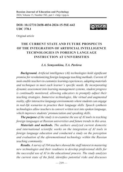 Semyonkina I.A. (Семёнкина И.А.). The Current State and Future Prospects of the Integration of Artificial Intelligence Technologies in Foreign Language Instruction at Universities = Современное состояние и перспективы внедрения технологий искусственного