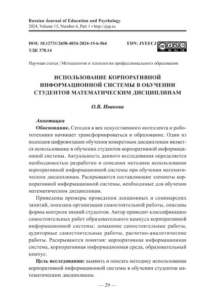 Иванова, О.В. Использование корпоративной информационной системы в обучении студентов математическим дисциплинам // Russian Journal of Education and Psychology. – 2024. – № 6. — С. 29-49. — Только в электронном виде. — <URL:http://elib.fa.ru/art2024/bv3286.pdf>.