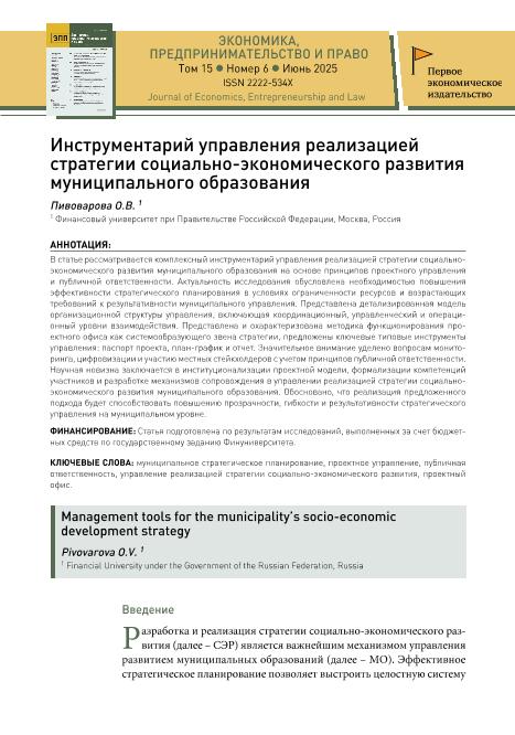 Пивоварова, О.В. Инструментарий управления реализацией стратегии социально-экономического развития муниципального образования // Экономика, предпринимательство и право. – 2025. – № 6. — С. 3775–3788. — Только в электронном виде. — <URL:http://elib.fa.ru/art2025/bv1525.pdf>.