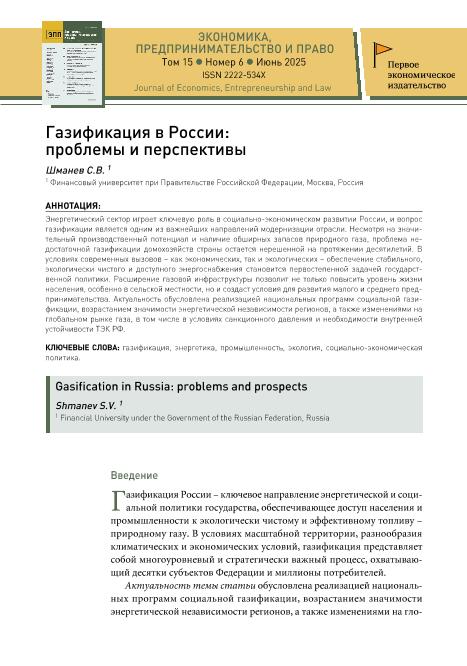 Шманев, С.В. Газификация в России: проблемы и перспективы // Экономика, предпринимательство и право. – 2025. – № 6. — С. 4093–4108. — Только в электронном виде. — <URL:http://elib.fa.ru/art2025/bv1630.pdf>.