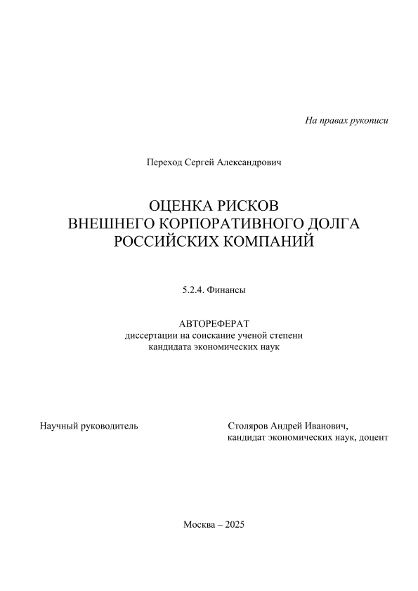 Переход, Сергей Александрович. Оценка рисков внешнего корпоративного долга российских компаний: автореферат дис. ... кандидата экономических наук ; спец. 5.2.4, защищена 17.09.2025 / С.А. Переход; Место защиты: Финуниверситет, Работа выполнена: «Национальный исследовательский университет «Высшая школа экономики»". — Москва, 2025. — 26 с. — Свободный доступ из сети Интернет (чтение). — <URL:http://elib.fa.ru/avtoreferat/Perekhod.pdf>.