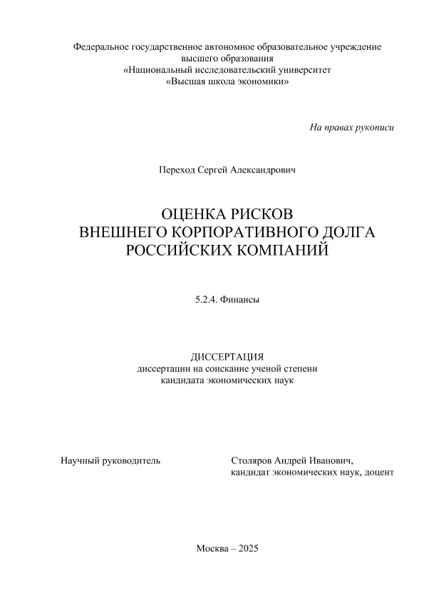 Переход, Сергей Александрович. Оценка рисков внешнего корпоративного долга российских компаний: дис. ... кандидата экономических наук ; спец. 5.2.4, защищена 17.09.2025 / С.А. Переход; Место защиты: Финуниверситет, Работа выполнена: «Национальный исследовательский университет «Высшая школа экономики»". — Москва, 2025. — 146 с. — Свободный доступ из сети Интернет (чтение). — <URL:http://elib.fa.ru/avtoreferat/Perekhod_diss.pdf>.