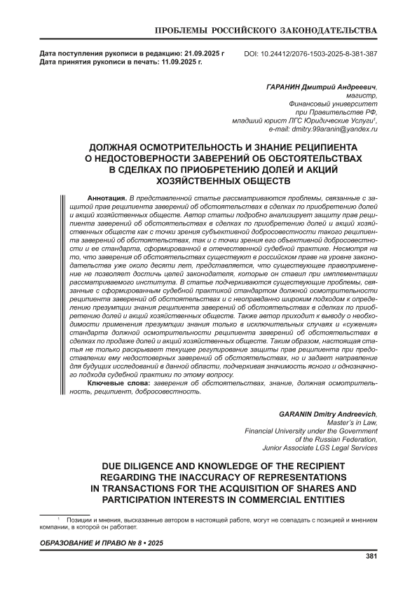 Гаранин, Д.А. Должная осмотрительность и знание реципиента о недостоверности заверений об обстоятельствах в сделках по приобретению долей и акций хозяйственных обществ // Образование и право. – 2025. – № 8. — С. 381-387. — Только в электронном виде. — <URL:http://elib.fa.ru/art2025/bv2537.pdf>.