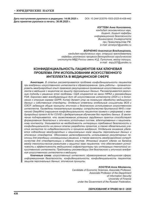 Когтева, А.Н. Конфиденциальность пациентов как ключевая проблема при использовании искусственного интеллекта в медицинской сфере / А.Н. Когтева, А.В. Волченко // Образование и право. – 2025. – № 6. — С. 438-442. — Только в электронном виде. — <URL:http://elib.fa.ru/art2025/bv2550.pdf>.