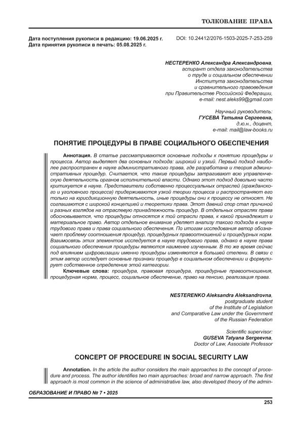 Нестеренко, А.А. Понятие процедуры в праве социального обеспечения / А.А. Нестеренко, Т.С. Гусева // Образование и право. – 2025. – № 7. — С. 253-259. — Только в электронном виде. — <URL:http://elib.fa.ru/art2025/bv2566.pdf>.