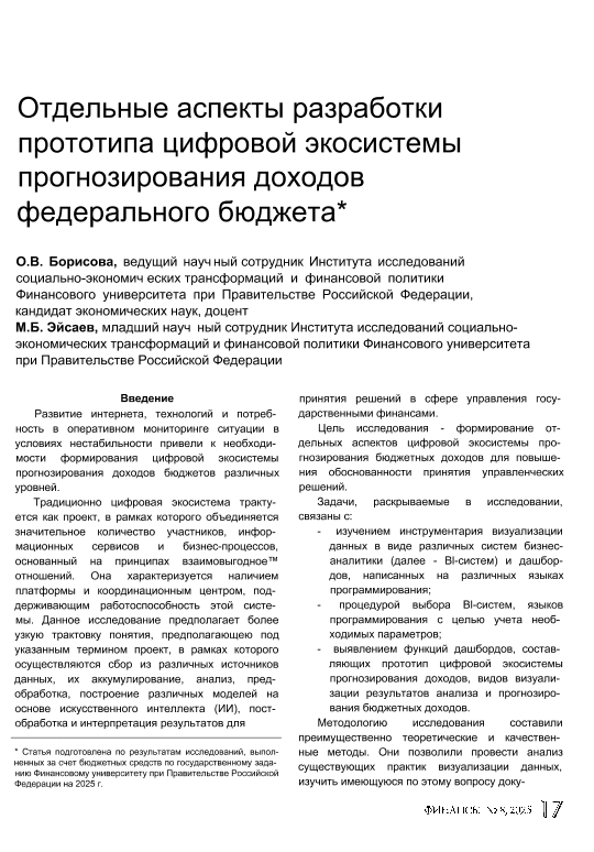 Борисова, О.В. Отдельные аспекты разработки прототипа цифровой экосистемы прогнозирования доходов федерального бюджета / О.В. Борисова, М.Б. Эйсаев // Финансы. – 2025. – № 8. — С. 17-24 — <URL:http://elib.fa.ru/art2025/bv398.pdf>.