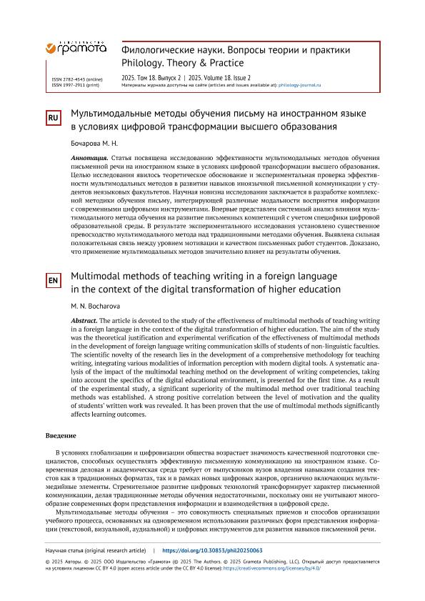 Бочарова, М.Н. Мультимодальные методы обучения письму на иностранном языке в условиях цифровой трансформации высшего образования // Филологические науки. Вопросы теории и практики. – 2025. – № 2. — С. 439-447. — Только в электронном виде. — <URL:http://elib.fa.ru/art2025/bv400.pdf>.