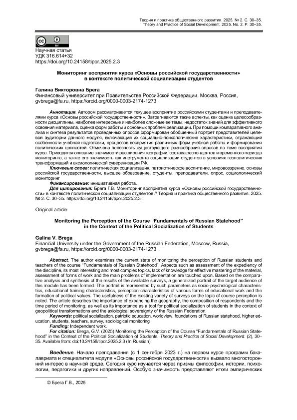 Брега, Г.В. Мониторинг восприятия курса «Основы российской государственности» в контексте политической социализации студентов // Теория и практика общественного развития. – 2025. – № 2. — С. 30-35. — Только в электронном виде. — <URL:http://elib.fa.ru/art2025/bv401.pdf>.