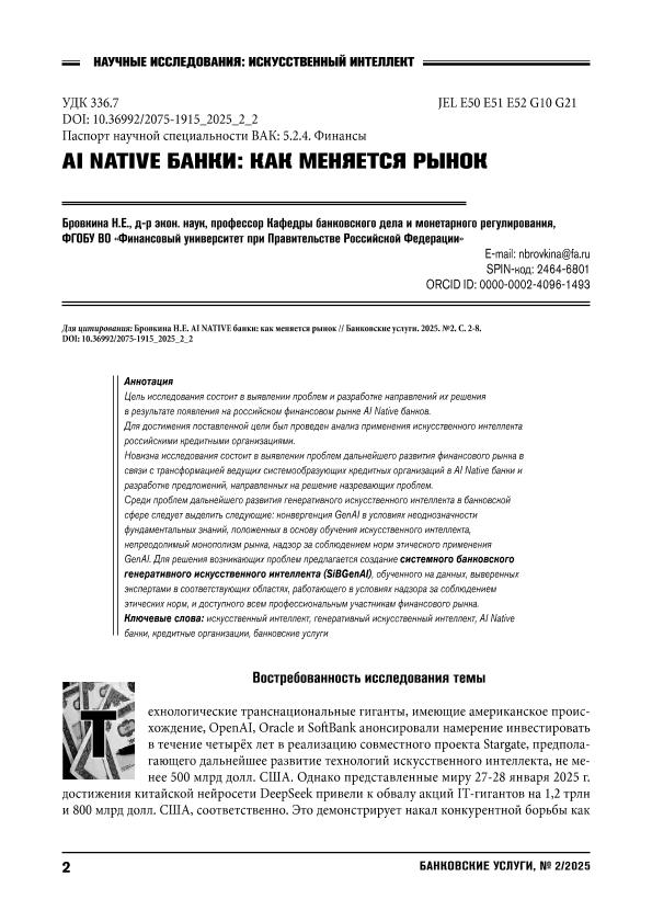 Бровкина, Н.Е. AI Native банки: как меняется рынок // Банковские услуги. – 2025. – № 2. — С. 2-8. — Только в электронном виде. — <URL:http://elib.fa.ru/art2025/bv402.pdf>.