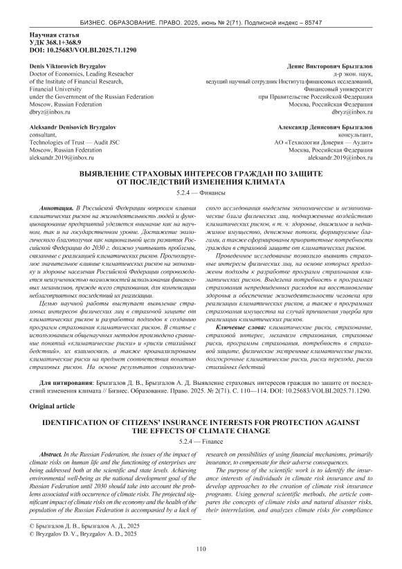 Брызгалов, Д.В. Выявление страховых интересов граждан по защите от последствий изменения климата / Д.В. Брызгалов, А.Д. Брызгалов // Бизнес. Образование. Право. – 2025. – № 2. — С. 110-114. — Только в электронном виде. — <URL:http://elib.fa.ru/art2025/bv403.pdf>.