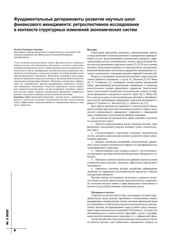 Будкина, Е.С. Фундаментальные детерминанты развития научных школ финансового менеджмента: ретроспективное исследование в контексте структурных изменений экономических систем // Экономика строительства. – 2025. – № 3. — С. 8-12. — Только в электронном виде. — <URL:http://elib.fa.ru/art2025/bv405.pdf>.