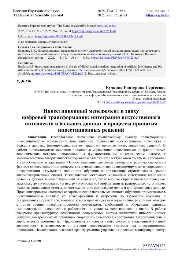 Будкина, Е.С. Инвестиционный менеджмент в эпоху цифровой трансформации: интеграция искусственного интеллекта и больших данных в процессы принятия инвестиционных решений. — Текст: электронный // Вестник Евразийской науки. – 2025. – № s1. — URL: https://esj.today/PDF/83FAVN125.pdf (дата обращения: 17.09.2025) — <URL:http://elib.fa.ru/art2025/bv406.pdf>.