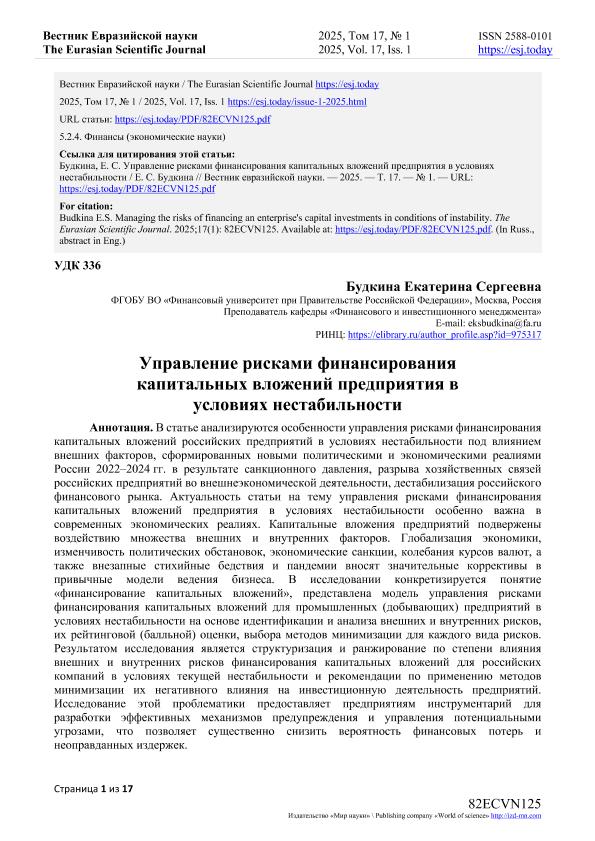 Будкина, Е.С. Управление рисками финансирования капитальных вложений предприятия в условиях нестабильности. — Текст: электронный // Вестник Евразийской науки. – 2025. – № 1. — URL: https://esj.today/PDF/82ECVN125.pdf (дата обращения: 13.10.2025) — <URL:http://elib.fa.ru/art2025/bv407.pdf>.