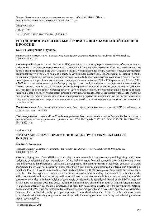 Наумова, К.А. Устойчивое развитие быстрорастущих компаний-газелей в России // Вестник Челябинского государственного университета. – 2024. – № 12. — С. 133-142. — Только в электронном виде. — <URL:http://elib.fa.ru/art2024/bv3759.pdf>.