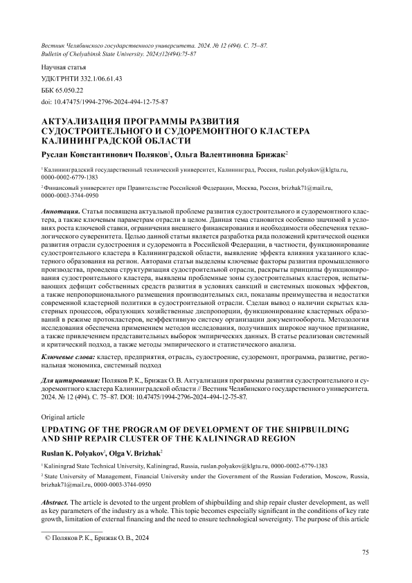 Поляков, Р.К. Актуализация программы развития судостроительного и судоремонтного кластера Калининградской области / Р.К. Поляков, О.В. Брижак // Вестник Челябинского государственного университета. – 2024. – № 12. — С. 75-87. — Только в электронном виде. — <URL:http://elib.fa.ru/art2024/bv3764.pdf>.