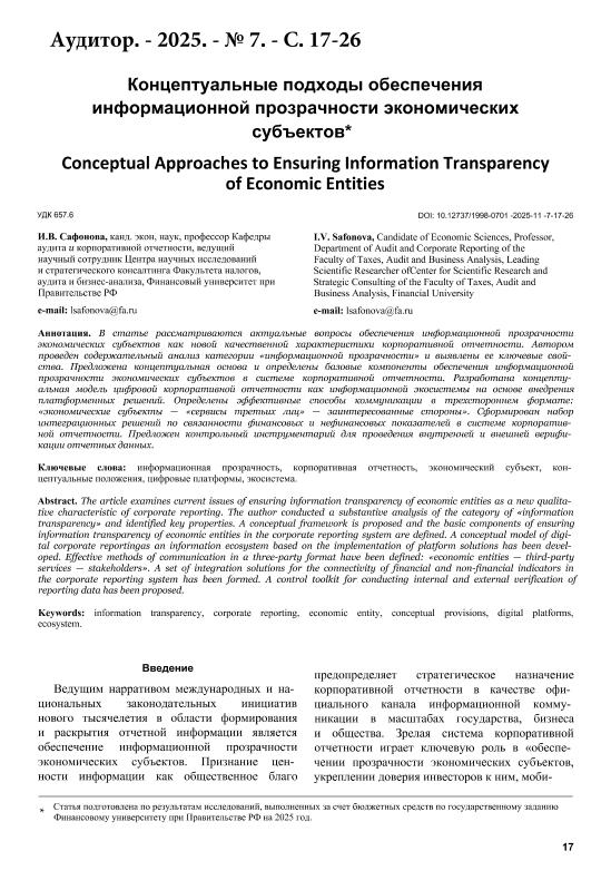 Сафонова, И.В. Концептуальные подходы обеспечения информационной прозрачности экономических субъектов // Аудитор. – 2025. – № 7. — С. 17-26. — Хранение – Верхняя Масловка, 15. — <URL:http://elib.fa.ru/art2025/bv1568.pdf>.